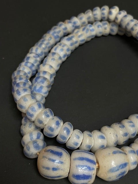 Lange vintage handelskralen ketting uit Ghana wit-blauw